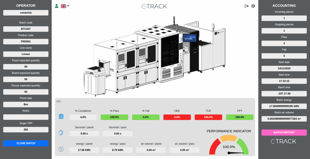 C-Track è il software di Canavisia dedicato al tracking dei lotti di produzione, progettato per garantire tracciabilità e controllo di ogni lotto del processo produttivo. La piattaforma consente di monitorare codice prodotto e lotto, lato scheda, ecc.., associando informazioni su operatore, quantità prodotta e KPI rilevanti.